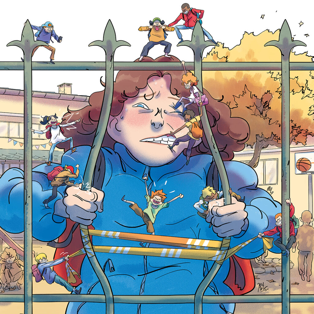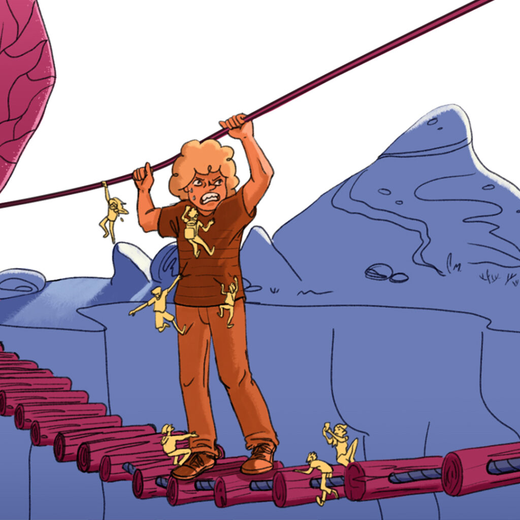 Seul.e en cet instant, vivant.e et en sécurité, regarde-toi dans le miroir. Imagine-toi puissant.e et invulnérable, tel le géant du jeu. Imagine-toi grandir dans l’eau de mer, traverser le pont de singe, malgré les harceleur.es qui reviennent sans relâche.